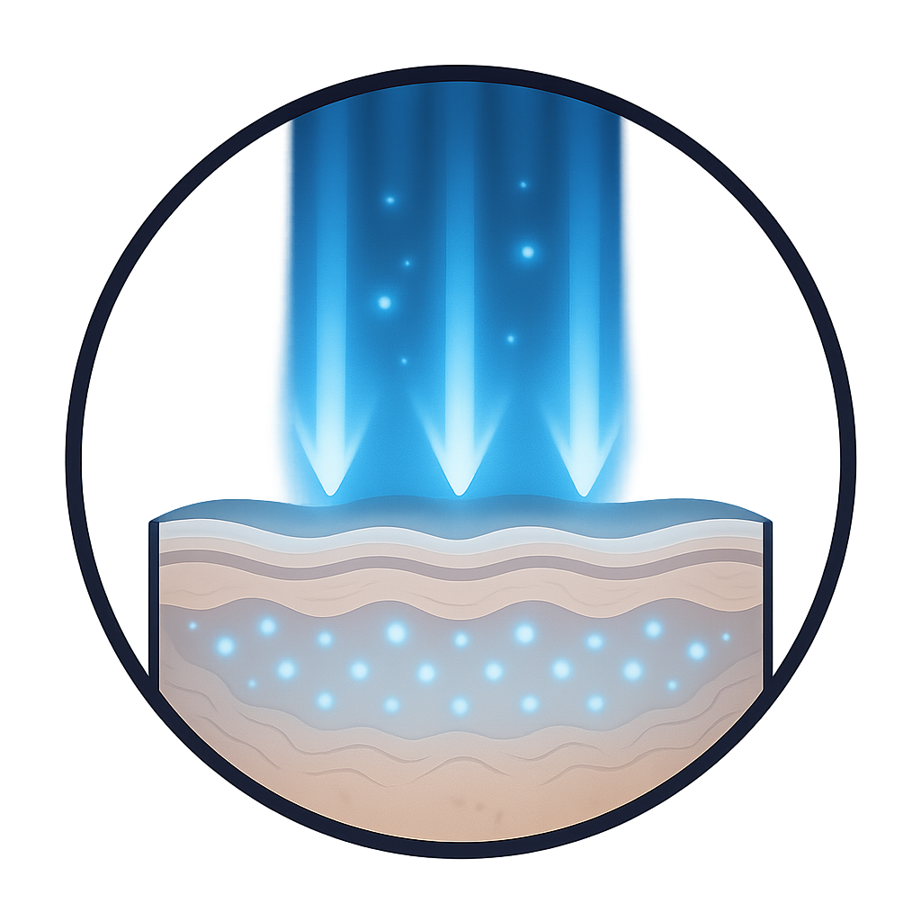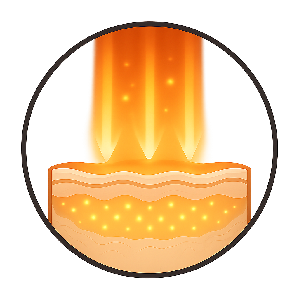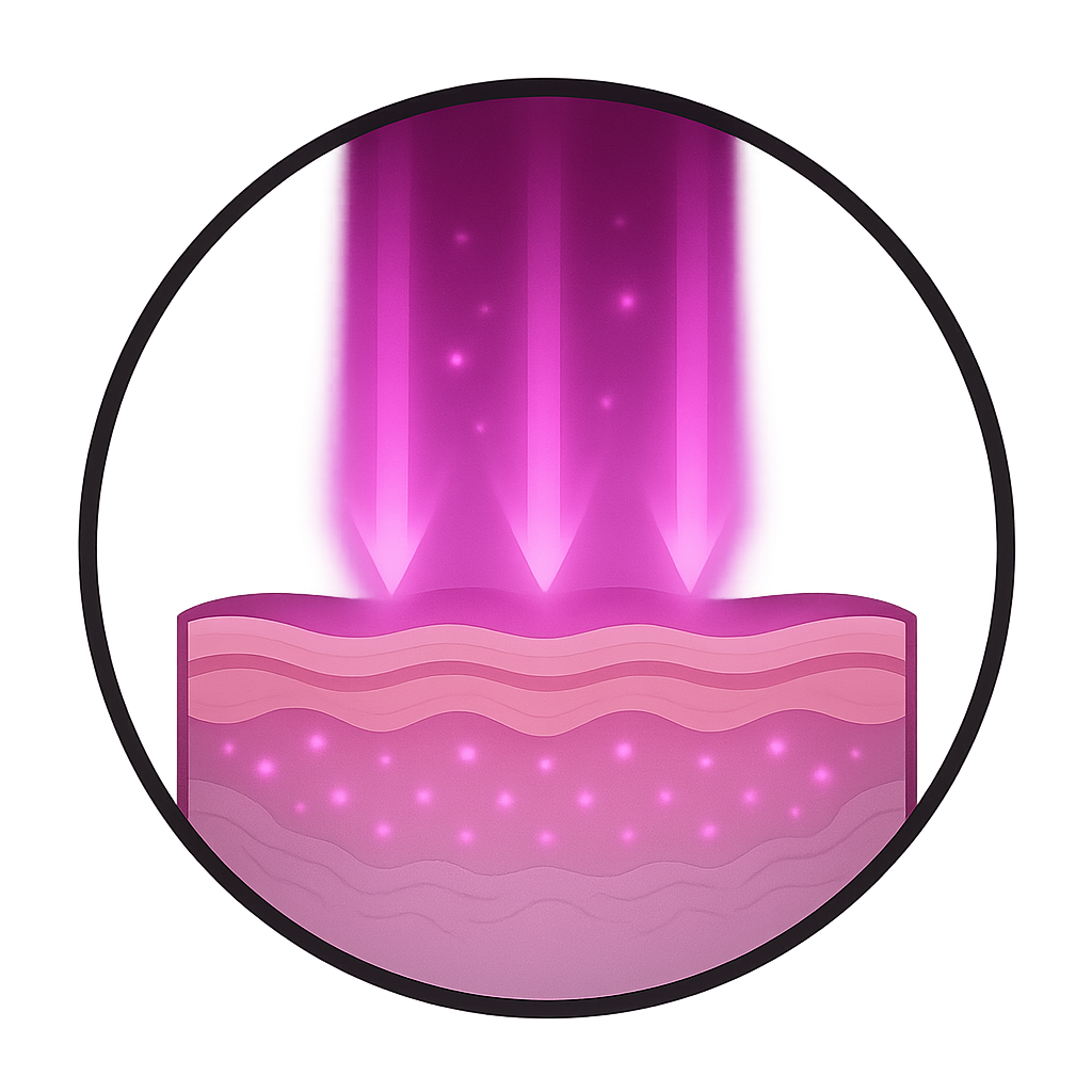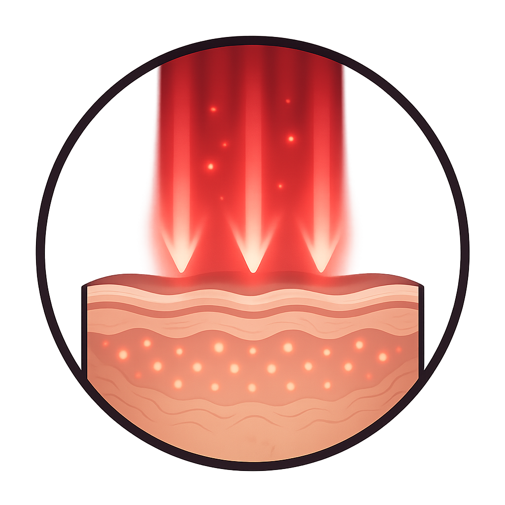 Nahinfrarot (850 nm) – dringt tief in das Gewebe ein, aktiviert den Stoffwechsel und unterstützt die Heilung von innen heraus.